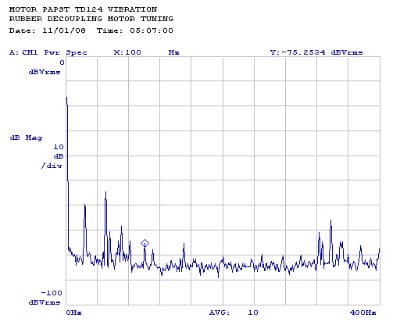 The graph shows the noise spectrum of the TD-124 with a Papst motor with a standard 470nF capacitor and mounted with standard decoupling rubbers.
